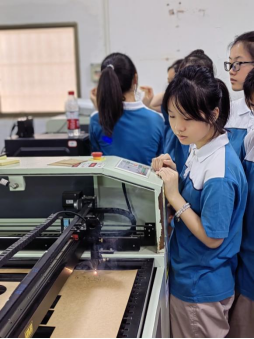 在制作实践环节,同学们分组开展激光制作和3D打印的动手操作。随着一件件实践作品的完成,同学们欢呼雀跃,相互展示自己的实践成果,分享快乐与收获。