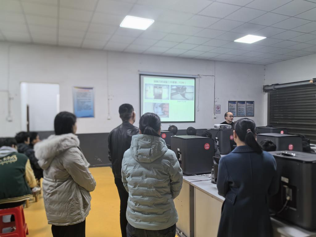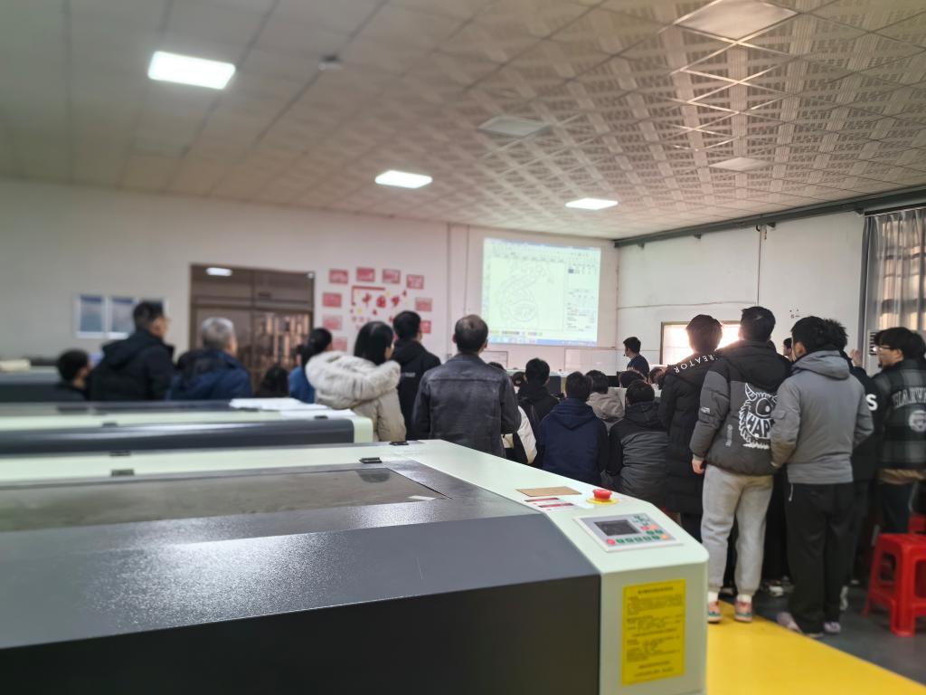 在激光雕切实训教学时,陈卓威老师从加工参数的设置入手,详细讲解了激光雕切加工的实操步骤,并对激光加工过程中可能出现的安全问题进行了强调和演示。课上,他鼓励员工们积极提问,课堂气氛十分活跃。